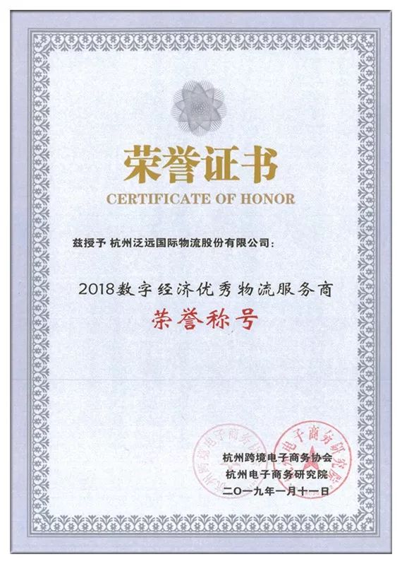 2019年1月11日,由杭州市商务委员会、中国(杭州)跨境电子商务综合试验区领导小组办公室指导,杭州跨境电子商务协会(HCEA)、杭州电子商务研究院、中国物流与采购联合会电子商务物流与快递分会主办的2019首届数字贸易与全球供应链高峰论坛暨杭州跨境电子商务协会三周年庆典在杭州蓝天清水湾国际大酒店顺利召开。本次峰会聚焦国内外行业精英,全面赋能跨境电商,共同探讨如何让数字贸易真正面向世界、走向全球市场,泛远国际物流荣获“2018数字经济优秀物流服务商”称号。